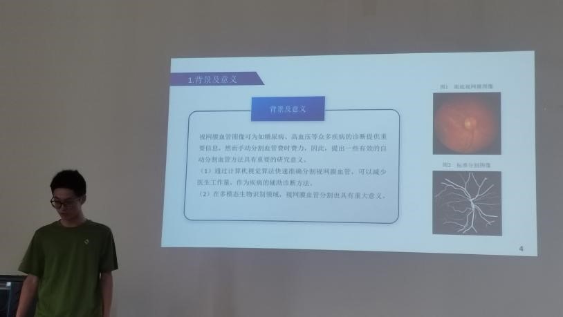 尤泽宇的报告题目是“基于Attention的视网膜图像分割”,该报告提出了基于注意力机制的CAS-UNet视网膜分割方法。该模型提出了交叉融合注意力机制和加法注意力机制,来加强对视网膜图片的分割细节,解决了现阶段大多数模型无法同时分割出局部细节与全局细节的问题。在实验效果上该模型相较于D-MNet有明显的提升。