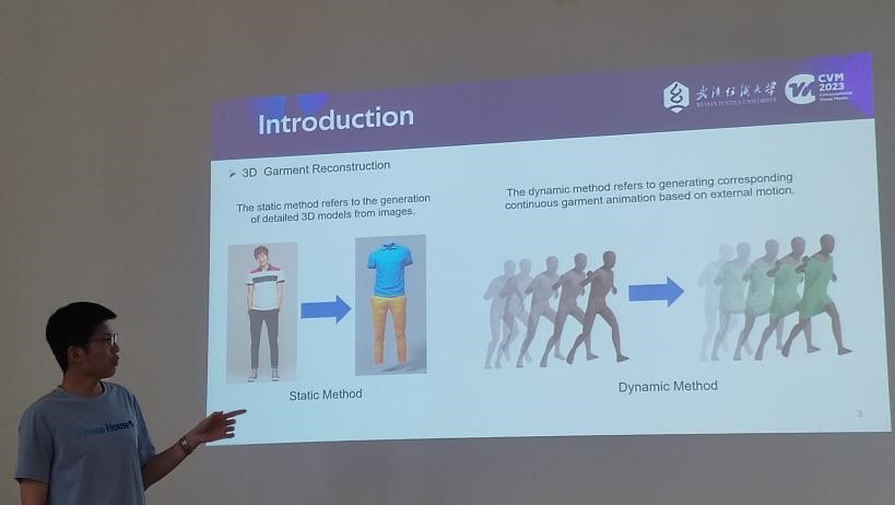 邝捷文的报告题目是“GSNet: Generating 3D Garment Animation via Graph Skinning Network”。该报告提出了基于图时序的蒙皮网络模型,用于三维服装的动态仿真。课题组研究发现,当前基于深度学习的服装仿真存在前后帧时序不关联等问题,因此他提出和设计了基于图时序的蒙皮网络来进行服装动态仿真。该模型的定性和定量实验结果相较于基于单帧物理约束的方法效果更加准确,效率更加高效。