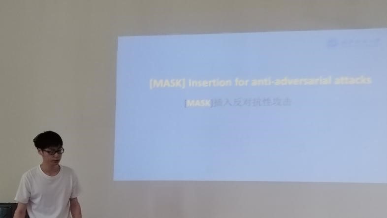 徐策的报告题目是“[MASK] Insertion: a robust method for anti-adversarial attacks”。该报告提出了基于在模型训练和推理时插入[MASK]掩码的方法,用于防御文本对抗攻击,提升模型的鲁棒性。研究发现,现有的数据增强方法中,模型增强方法和随机平滑方法分别需要生成对抗样本,对模型超参数比较敏感,并且需要大量的运算时间,而插入[MASK]方法不存在上述问题。在实验效果上,该模型的实验结果相较于RANMASK(随机平滑)与flooding-x(模型增强)方法有明显地提升,并且通过大量的消融实验证明了该方法的有效性。
