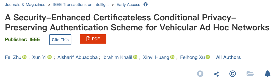 近日,永利yl23411集团边缘计算与信息安全团队青年教师朱飞博士在车载网安全认证方面取得了重要研究进展。成果“A Security-Enhanced Certificateless Conditional Privacy-Preserving Authentication Scheme for Vehicular Ad Hoc Networks”在智能交通领域顶级期刊IEEE Transactions on Intelligent Transportation Systems(IEEE TITS,中科院一区Top,IF 9.551)上发表。永利yl23411集团为该论文的第一作者单位。