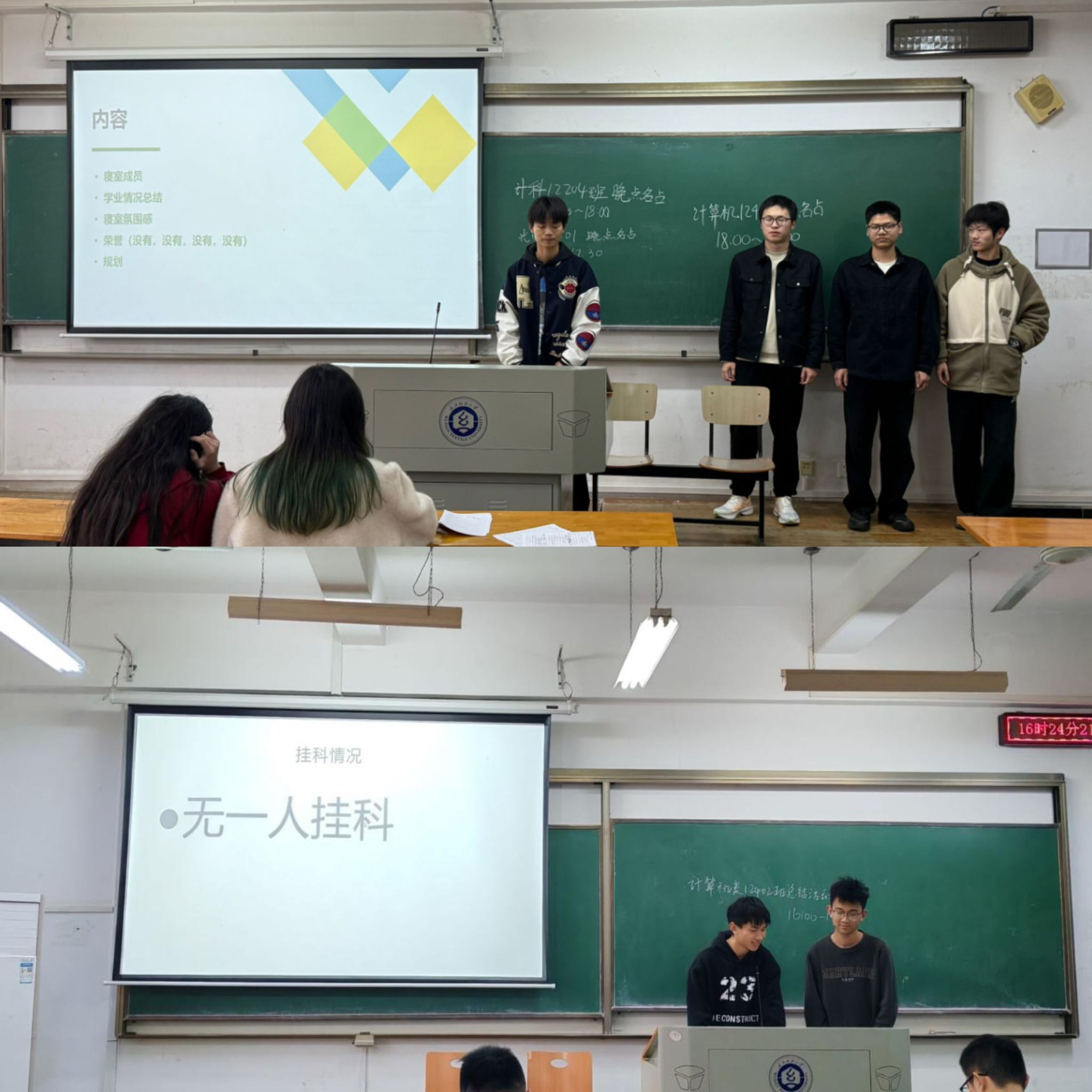 各宿舍通过PPT、短视频等形式生动展示寝室成员特色与生活风貌。例如,12B403宿舍以“代码与热爱共存”为主题,介绍了四位成员在专业学习、文艺体育等领域的特长,并分享了寝室值日表、安全自查记录等制度,自大学入校之初,该宿舍成员就始终秉持着“宿舍是大学的第一个家,室友是随机分配的家人”这一理念友好相处;12B203宿舍则以幽默的“程序员日常”短片,呈现了整洁的书桌、规范的用电环境以及寝室文化墙的设计成果。辅导员李港特别表扬了全体宿舍本学期的安全零违规记录,并强调“安全是集体生活的第一准则”。