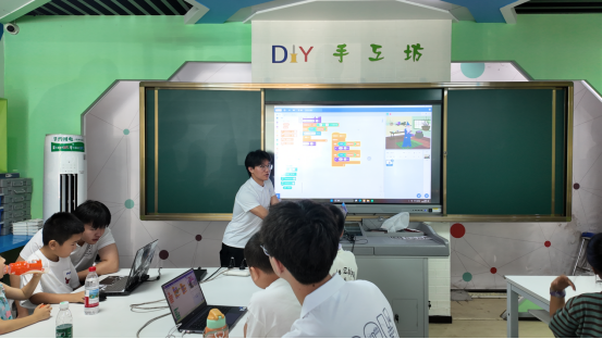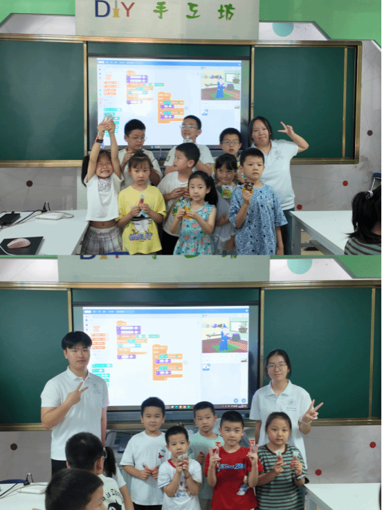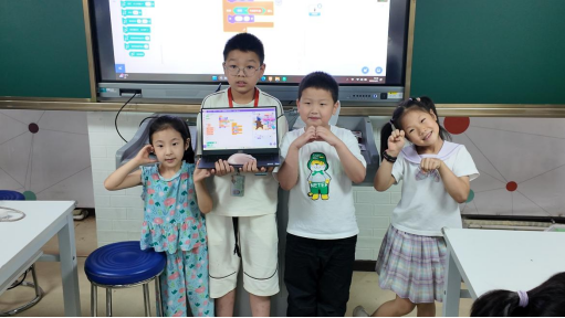 为提升课堂趣味性与协作能力,实践团将全班划分为五个小组,引导员工组内互助、协作完成挑战任务。在互动与演示环节,孩子们积极展示自己的程序作品,展现出出色的表达力与逻辑思维。根据课堂表现、作品完成度、互动积极度等综合评分,第五组最终获得本次课程积分排名第一名。其中,王一州与郭云泽两位小朋友表现尤为突出,逻辑清晰、反应敏捷,并在课堂演示中带动小组团队不断优化程序细节,赢得在场老师与小朋友们的阵阵掌声。