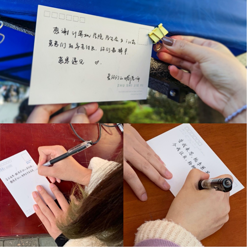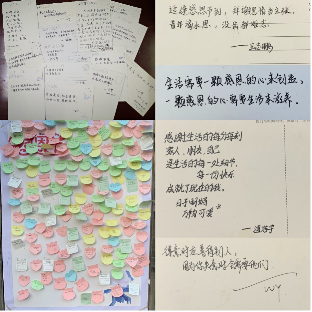 活动现场由i心苑工作人员负责向路过的同学宣传活动目的并引导参与活动的同学依次完成信息登记、想法收集等流程,同时也为参与活动的同学们准备了精美的小零食、小礼品。同学们可以将自己心中想要对父母、亲人或是身边同学、朋友表达的感恩之情利用亲自书写在现场领取的便利贴或精美的明信片上的一笔一划的文字展示出来。亦或是通过亲笔书写的文字对曾经帮助过自己的人表达出感谢之情或寄予美好的祝愿。