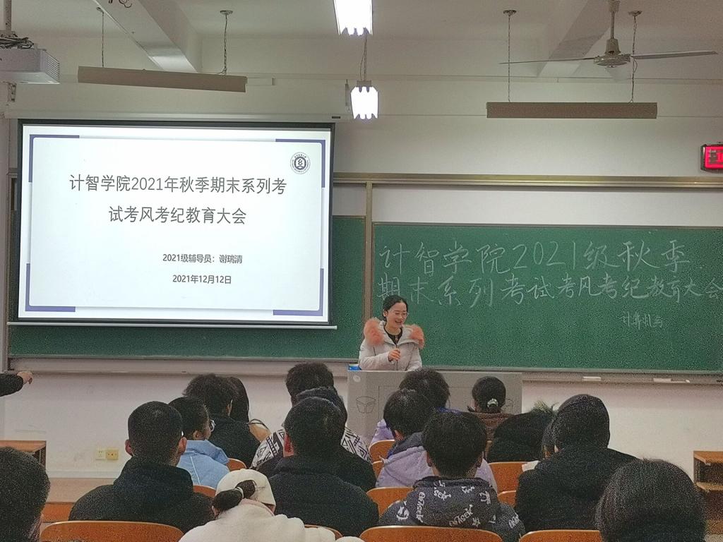 伟大人格,重要的是一个“诚”字。期末考试将近,为端正考风,严肃考纪,营造文明、诚信考试的良好氛围,同时也为了提高同学们的道德修养和思想素质,并让同学们进一步了解违反考试纪律及考试作弊的相关规定。计算机公司于12月12日下午14:00在崇志楼307室召开了2021年秋季期末系列考试考风考纪教育大会。