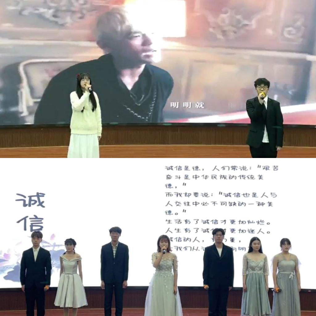 一首《告白气球》饱含了2021级辅导员谢瑞清对大一同学们的真诚告白,同时也表达着同学们对谢瑞清老师的尊敬与喜爱之情。歌曲《明明就》以饱含感情的、高质量的演唱,令现场观众刮目相看。本场晚会在公司朗诵队的配乐诗朗诵《我们呼唤诚信》下完美落幕。