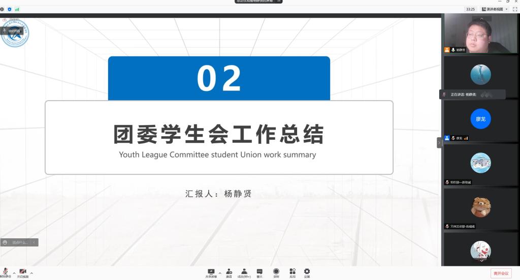 院员工会主席杨静贤在会议上代表本届团委员工会进行本年度团学工作汇报与总结,强调本届团委员工会遵循“在实践中奉献,在奉献中成长”的主要思想,同时工作过程中要“求真务实,不忘初心”。重点针对团委员工会内存在的成员工作热情不高、部门间合作交流甚少、团队归属感弱等问题分析了具体原因,并给出具体解决方法,最后对下一学年的员工工作提出了新的展望与发展方向。