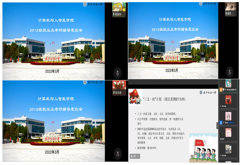 为进一步推进公司18级毕业生就业工作,帮助员工更充分、更高质量就业,公司于3月13日晚上举办线上就业及考研辅导恳谈会,邀请计科系主任彭涛教授做成长导航,就研究生复试和就业中的问题指点迷津,请18级已签约的曾路、张志诚、杨国萍三位同学做朋辈领航,交流找工作中的心得。毕业班辅导员廖龙以及18级计算机科学与技术专业全体员工参加线上会议。