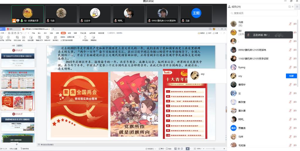 为了深入贯彻落实全国两会精神,引导员工深刻领会、准确把握两会精神实质,切实增强青年学子的责任感和历史使命感。计算机公司各个年级于3月13日,通过线上会议,组织全体同学统一开展了学习两会精神的主题班会,各年级辅导员、各班班主任全程参会。