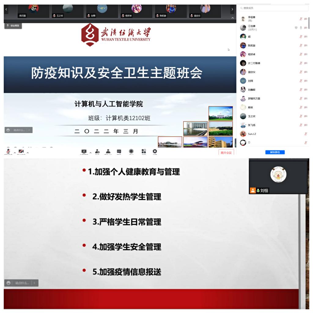 为认真贯彻落实疫情防控工作相关要求,切实做好校园疫情防控工作,防止校园疫情发生和蔓延,确保同学们的身体健康和生命安全,计算机公司于3月13日通过线上会议,组织各年级各班开展了“防疫知识及安全卫生”主题班会。