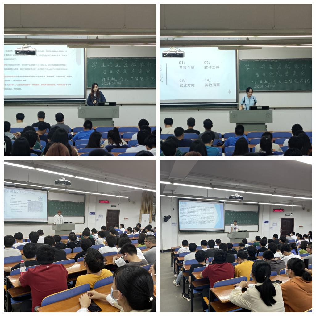为帮助21级员工合理规划大学学习,了解各个分流专业方向,更好地选择适合自己的专业,计算机公司于5月22日晚18:30-19:30、19:30-20:30分场次在T102教室开展朋辈间的专业分流恳谈会。本次恳谈会共邀请了9位大二的优秀同学结合自身经历,就自己所在专业的特点、开设课程、学习方法以及如何选择专业等方面的内容,为学弟学妹们答疑解惑,21级辅导员谢瑞清及全体21级员工参与此次恳谈会。