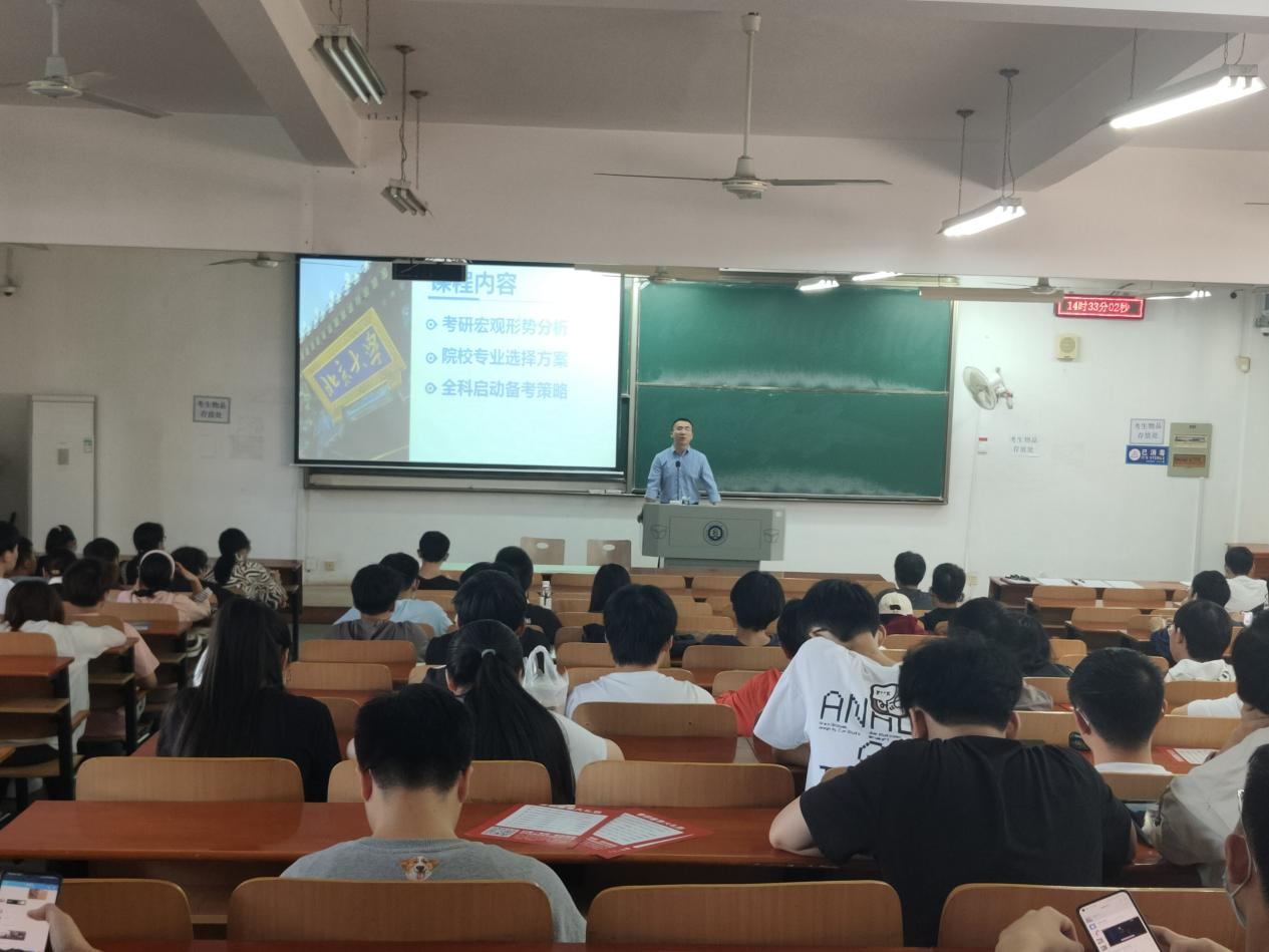谭小禹根据历年考研整体情况、院校专业选择和备考策略等展开了具体讲解。谭小禹强调同学们要尽早定考研规划、明确考研院校、评估自身实力,尽量选择上岸率高的好公司。他勉励同学们抓紧时间,提前起步,争取在考研中脱颖而出。参会同学们现场认真聆听,认真记录,表示通过讲座,进一步理清了考研备考思路,收获颇丰。