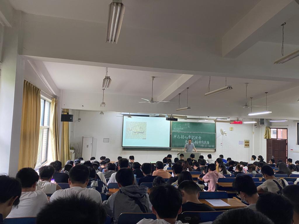 各年级辅导员首先播放了由中国井冈山干部公司姚玉珍、甘公荣、蔡军、王华生、袁建芳一行五人带来的《不忘初心牢记使命——井冈山精神代代传》互动访谈式“大思政课”录播影像,通过了解革命先辈们的光辉岁月,使同学们更加深刻领悟了革命先辈对革命事业的无限忠诚、对党的无限热爱和对家人的严格要求,深刻阐述了“坚定执着追理想,实事求是闯新路,艰苦奋斗攻难关,依靠群众求胜利”的井冈山精神。