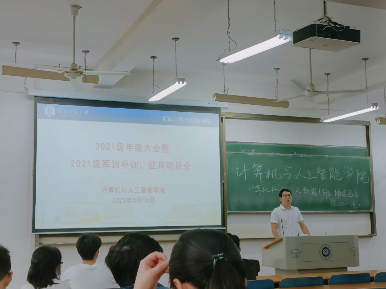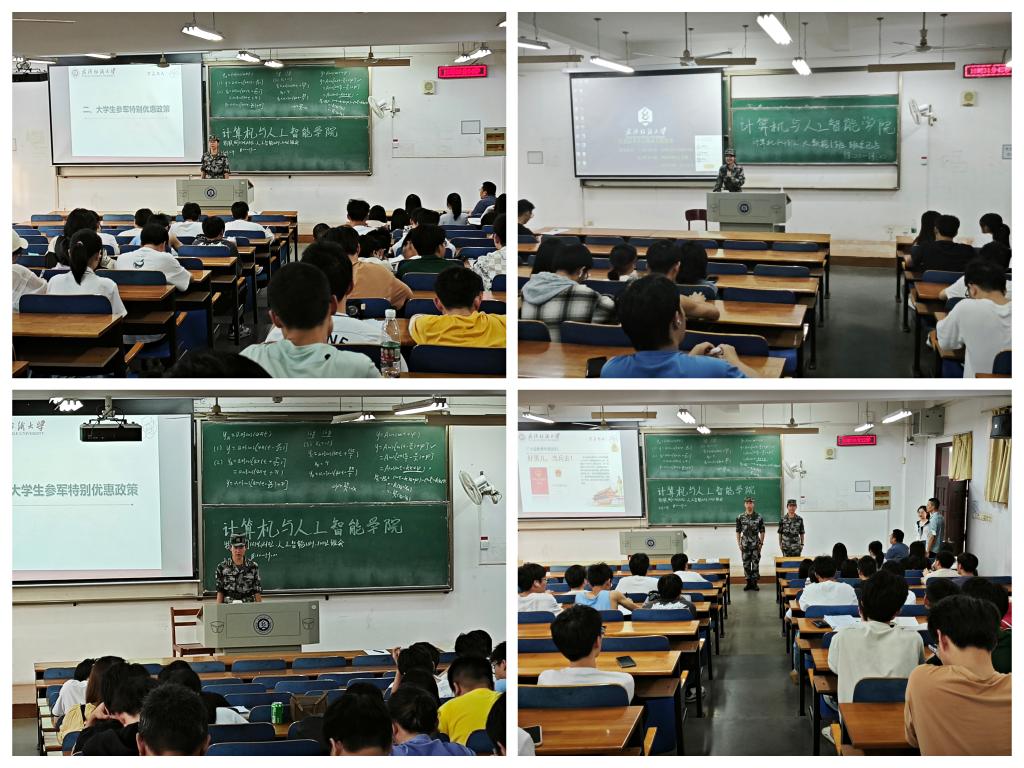 应征入伍宣讲会上,军训教官身穿统一的服装,以亲身经验向同学们做征兵宣讲。从部队基本简介、应征入伍基本条件、老员工参军特别优惠政策、大学毕业生参军优势几个方面详细讲解了老员工应征入伍的相关信息。并从着装、饮食、住宿、医疗、文体几个方面展示了丰富多彩的军营生活。同时也提醒各位同学要学会识别征兵防诈骗小技巧,通过正规渠道应征入伍。号召同学们积极响应国家的呼唤,为祖国的强盛付出自己的青春与汗水。