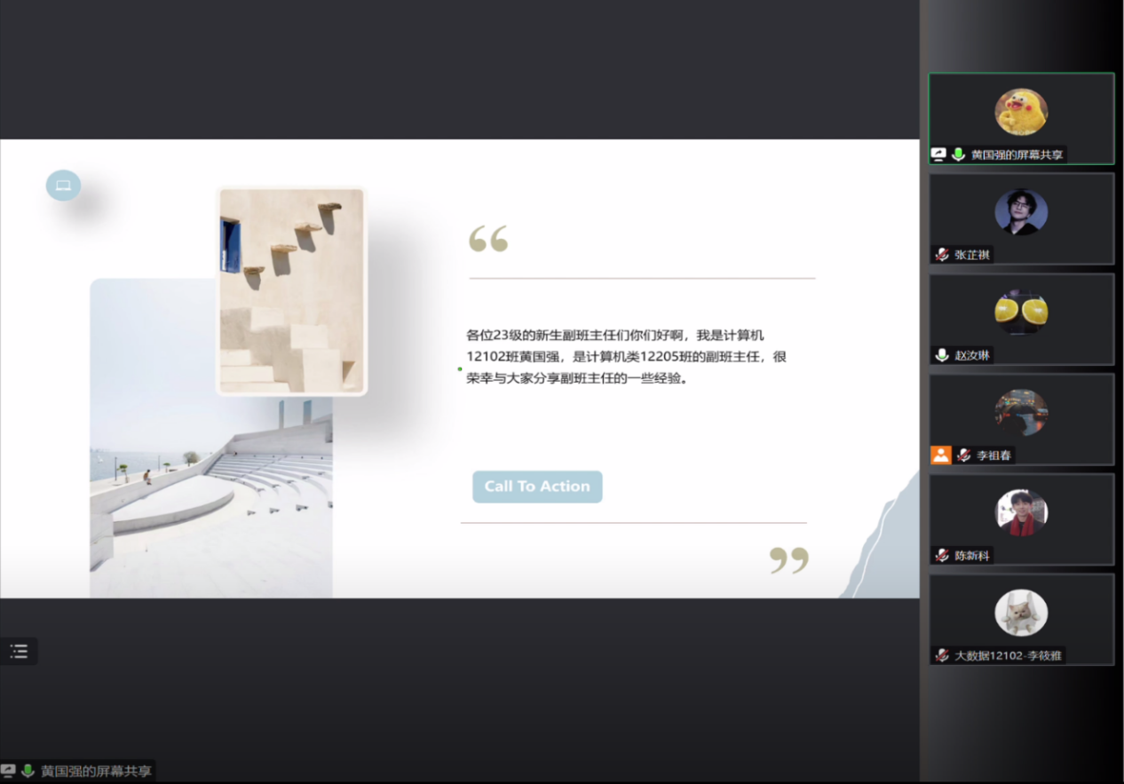 优秀副班主任代表黄国强详细介绍了新生开学前、入学后的任务,拉群、分工合作与每一位同学取得联系,帮助每位同学完成入学前各项工作,强调此时期要尽量摸清新生同学们的性格,与班助搭档合作完成各项任务。掌握新生入学情况,帮助新生完成开学事宜,及时为他们提供帮助,有特殊情况可以与辅导员反映。开学后则需帮助他们熟悉校园,选出班委,组织团建……希望新生副班主任珍视此次锻炼机会,严于律己,宽以待人,耐心陪伴新生班级,逐步成长。