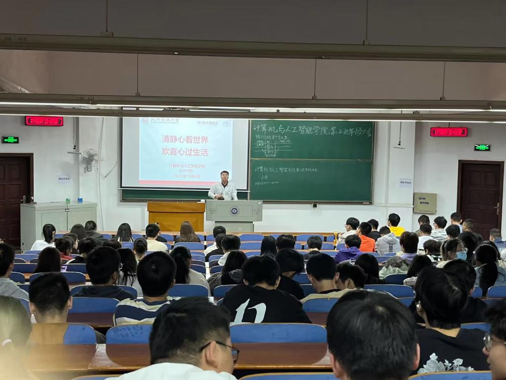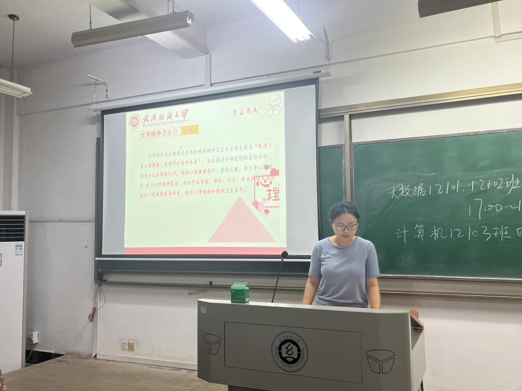 班会伊始,辅导员进行晚点名工作,对还未到场同学逐一进行联系。辅导员在班会上向同学们介绍了世界精神卫生日的由来和发展历程,并介绍公司在下半年即将开展的各类心理活动,鼓励同学们积极参加,利用心理活动舒缓学习生活中的各种压力。