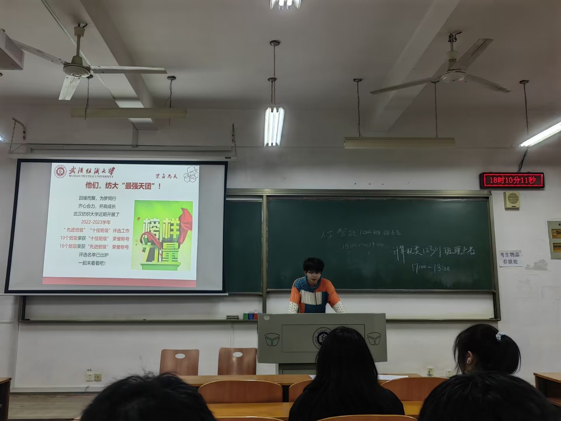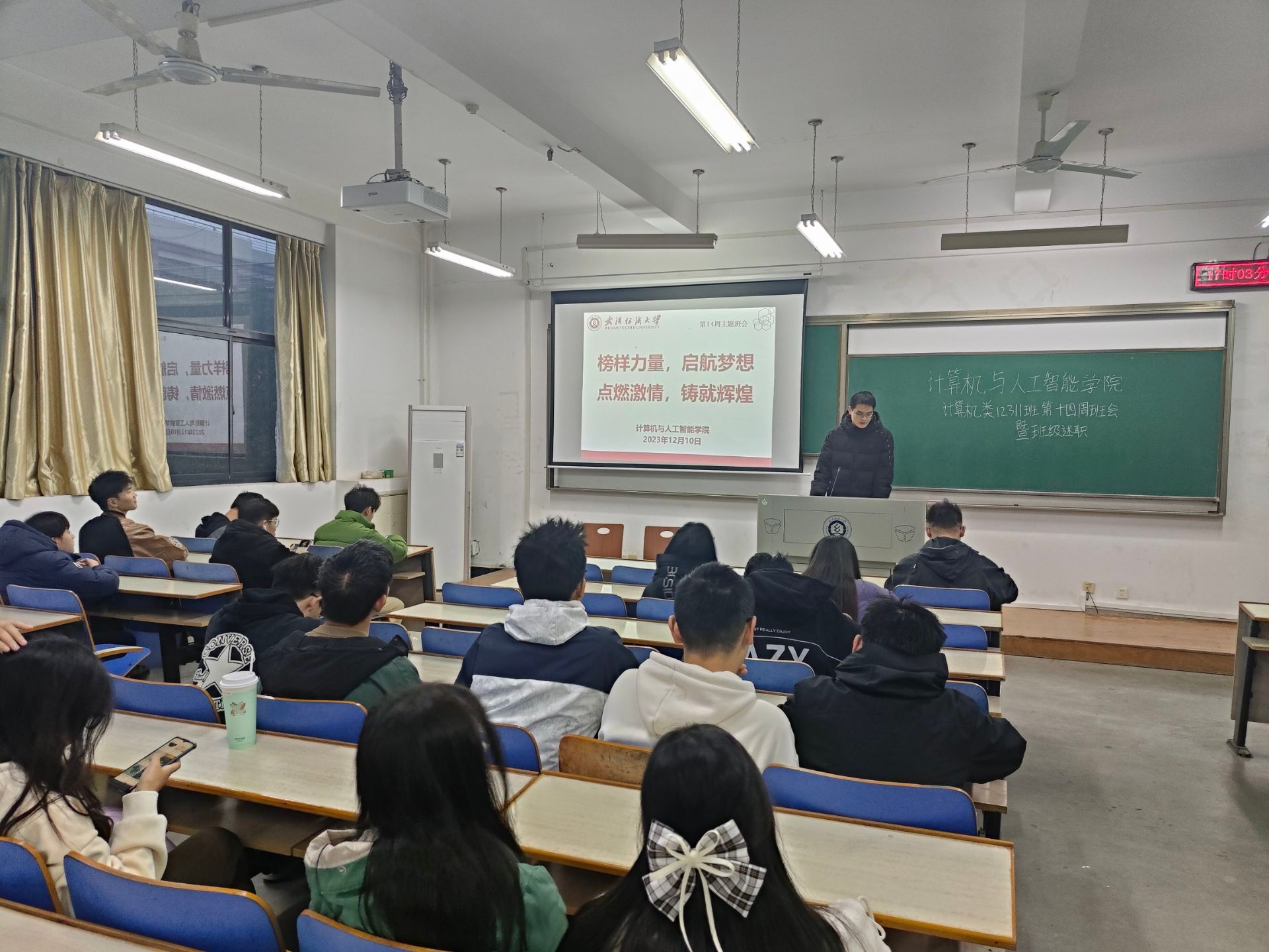 班会伊始,辅导员进行晚点名工作,对还未到场同学逐一进行联系。辅导员向同学们讲述了10个班级荣获“十佳班级”荣誉称号,16个班级荣获“先进班级”的故事,鼓励同学们榜样在前,勇敢追逐,将他们的坚韧和奋斗,化作我们前行的动力。