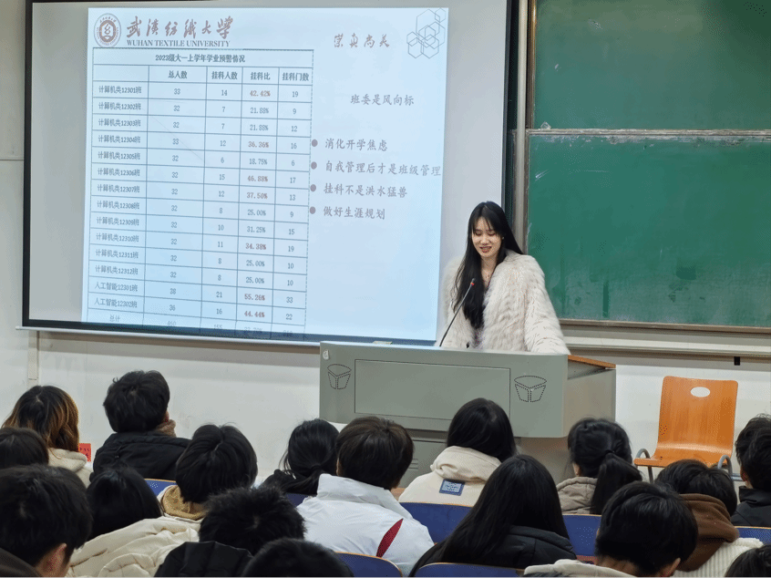 会议最后强调了本学期的几点工作重点:更加严格记录课堂考勤和大一年级的早晚自习考勤;更加经常进行查寝工作,做好寝室用电等安全的宣传工作;更加注重学风建设和员工个人成长;同时加强班级文化建设,提升班级凝聚力。