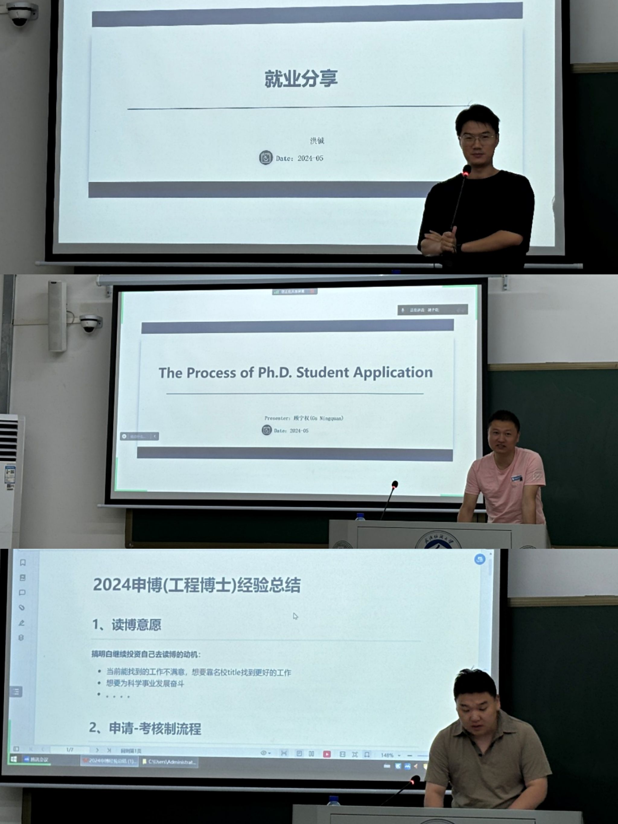 顾宁权以其丰富的国外博士申请经验为大家解惑,分享了申请技巧和注意事项,为想要以后迈入国际学术殿堂的员工指点迷津。原少将则从国内博士申请的角度出发,分享了他在国内求学的心得和体会,为想要在国内读博的员工提供了宝贵经验,也介绍了申请博士的流程。胡畅和樊旺伟带来了考公经验的分享。他们结合自身经验,逐步剖析了考公的重要性以及应对考试的方法。他们谈到了备考的艰辛,但更强调了坚持的重要性。洪铖和王子琪则从企业就业的角度出发,分享了就业经历和感悟,以及如何在求职过程中找到自己的定位和方向,为以后想要踏入企业的同学提供了一份实用指南。