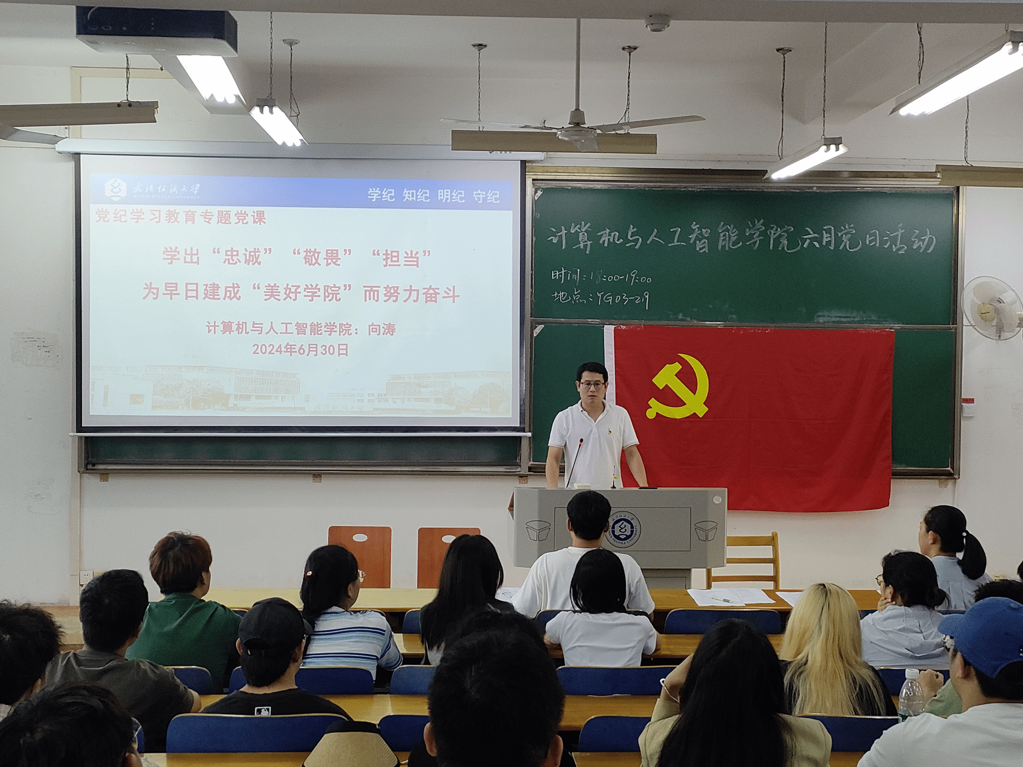为深入学习贯彻习近平总书记关于党纪学习教育的重要讲话和重要指示精神,引导员工党员学纪、知纪、明纪、守纪,6月30日下午,永利yl23411集团员工党支部于3号教学楼219教室开展党纪学习教育专题党课活动。会议由本科生第一党支部书记张栋主持,公司党委副书记向涛,辅导员廖龙、喻仪、余梦帆,全体员工党员共同参加。