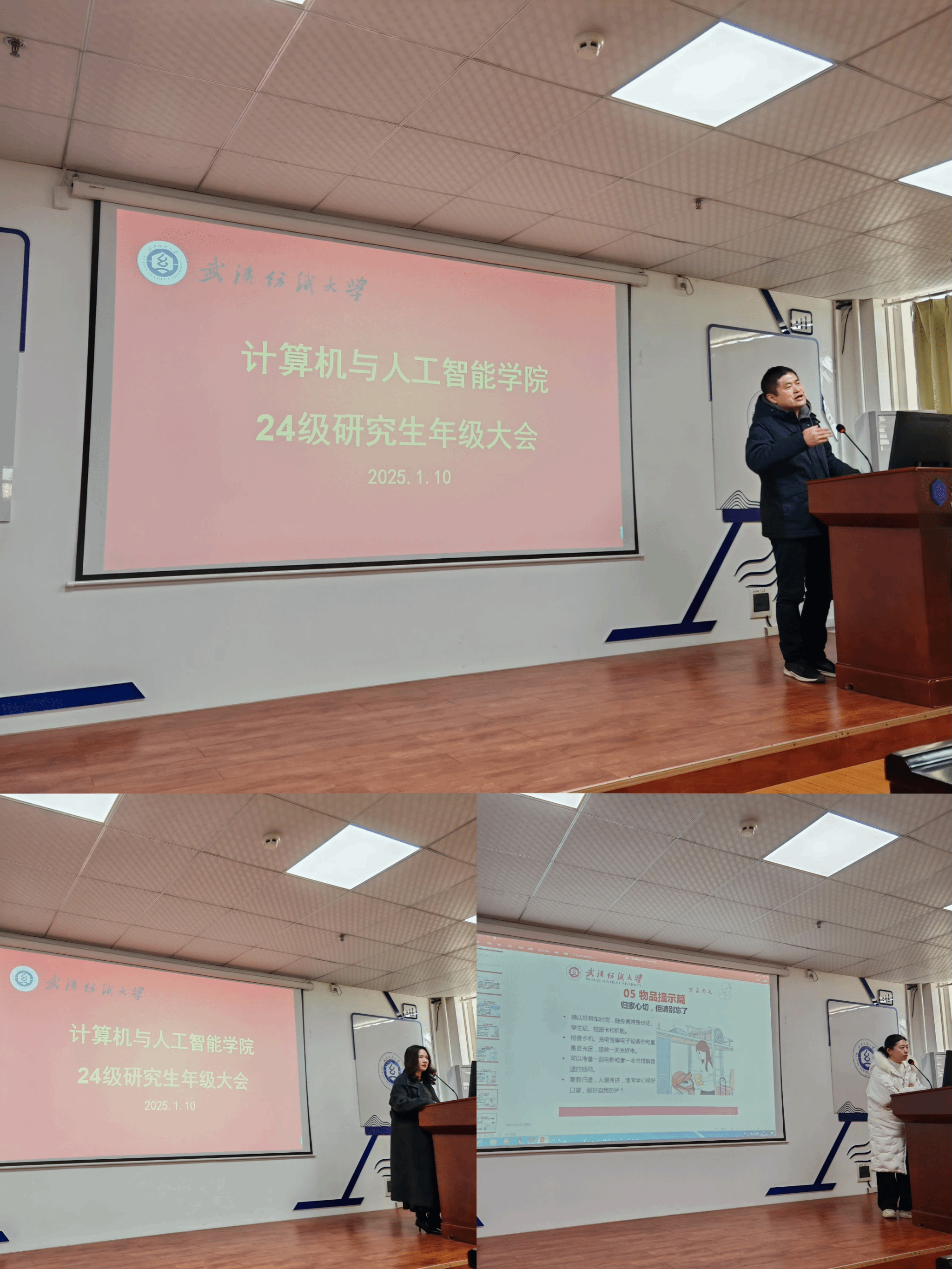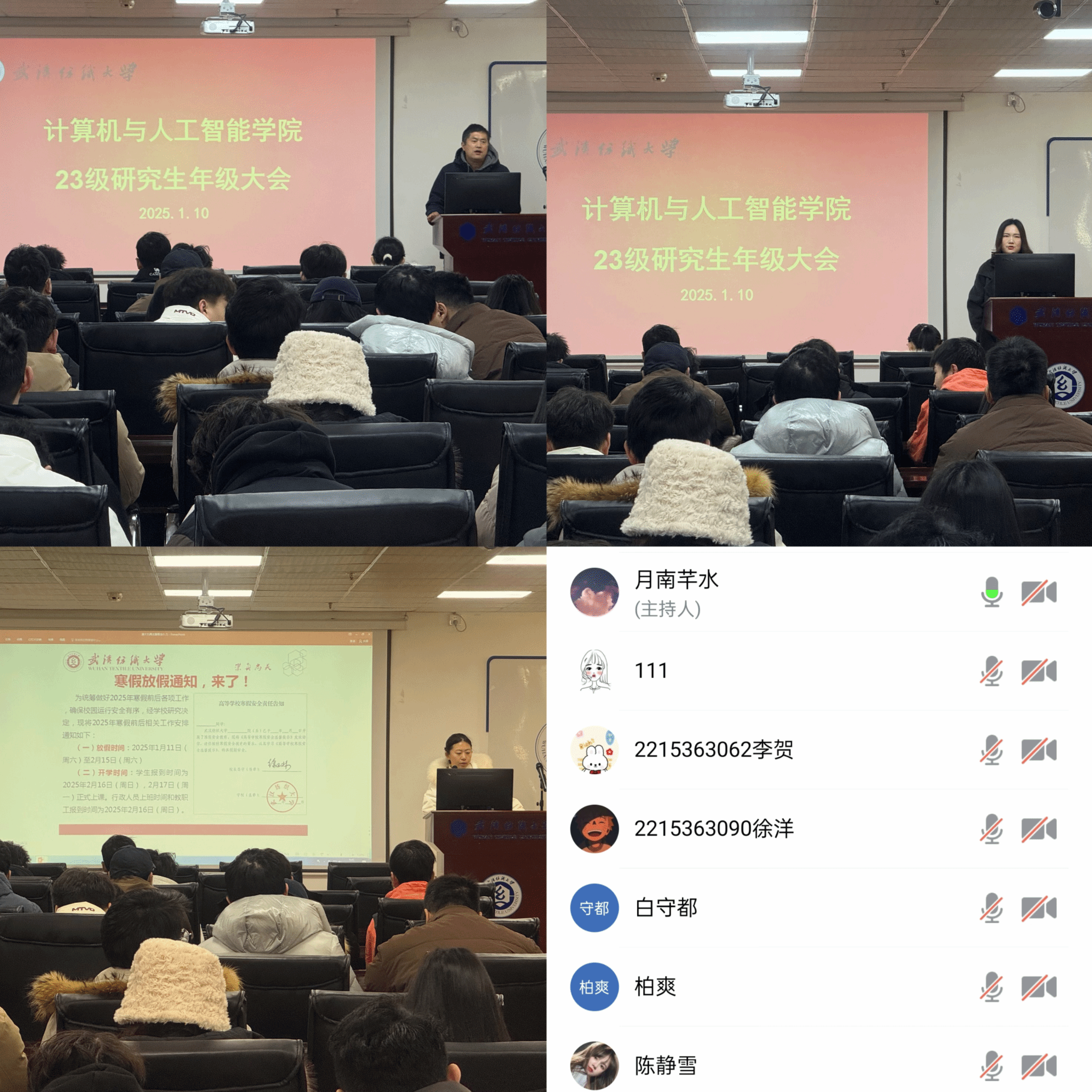 1月10日上午,公司在崇真楼南楼A4030召开了研究生寒假安全年级大会,参会人员有公司副经理魏雄、研究生教学秘书罗园、研究生辅导员余梦帆和全体研究生。
