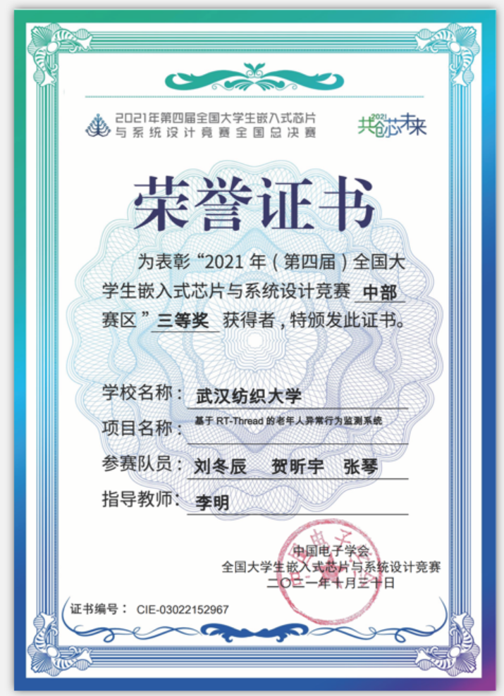 近日,第四届全国老员工嵌入式芯片与系统设计竞赛因疫情防控需要,在线上进行了决赛。经永利yl23411集团李明副教授指导,由19级本科生刘东辰、贺昕宇、张琴组成的参赛队伍完成了“基于RT-Thread的老年人异常行为检测系统”,荣获了三等奖。