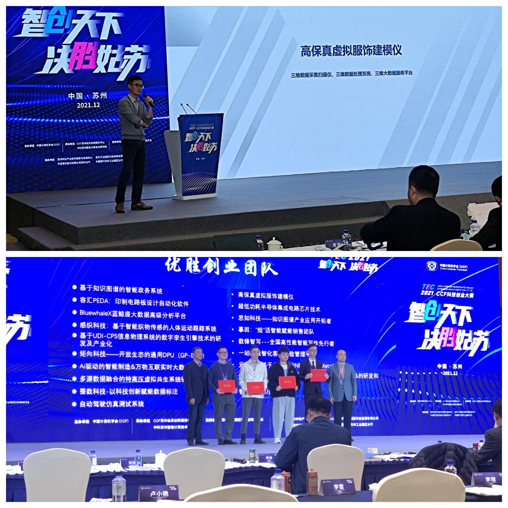 2021年9月,CCF首届科技创业大赛开始征集项目,受到广泛关注,来自19个省41个市的80多所高校、科研院所及创业公司积极报名,共有102个队伍参加比赛,其中不乏有清北等重点高校项目。最终经过评委会两轮评审,公司胡新荣教授项目“高保真虚拟服饰建模仪”成功入选,进入决赛。在决赛场上,胡新荣教授项目“高保真虚拟服饰建模仪”与清北等计算技术各领域的优秀创业团队竞争,经过激烈竞争,成功获得2021 CCF 科技创业大赛 TEC 2021 优胜奖。