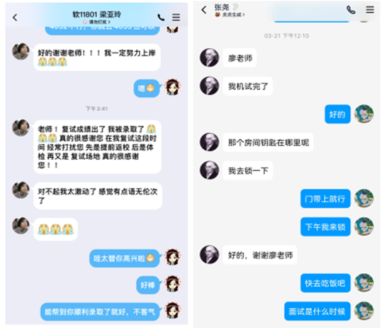 近日,参加完浙江大学研究生复试面试成绩不错的永利yl23411集团11801班张尧同学给辅导员老师第一时间发来感谢短信:“心里的大石头终于落地了,这里的无线网比宿舍快多了,感谢公司老师的暖心安排,希望自己能取得一个好成绩,对得起自己一直以来的努力和公司对我们考研同学的用心付出。” 已经被国防科技大学拟录取的软件11801班梁亚玲同学第一时间向辅导员报喜,感谢公司为他们复试“保驾护航”。