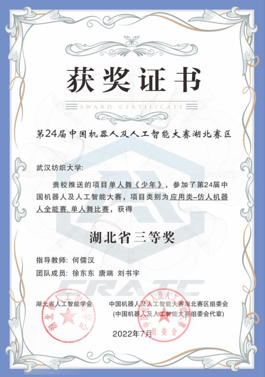 由永利yl23411集团何儒汉老师指导的三支代表队:员工邹生耀、顾宁权、梁景彬参加的仿人机器人点球比赛获得全国总决赛一等奖;员工邹生耀、顾宁权、张志众参加的仿人机器人短跑比赛获得全国总决赛一等奖;员工徐东东、唐端、刘书宇参加的单人舞项目获得省级比赛三等奖。