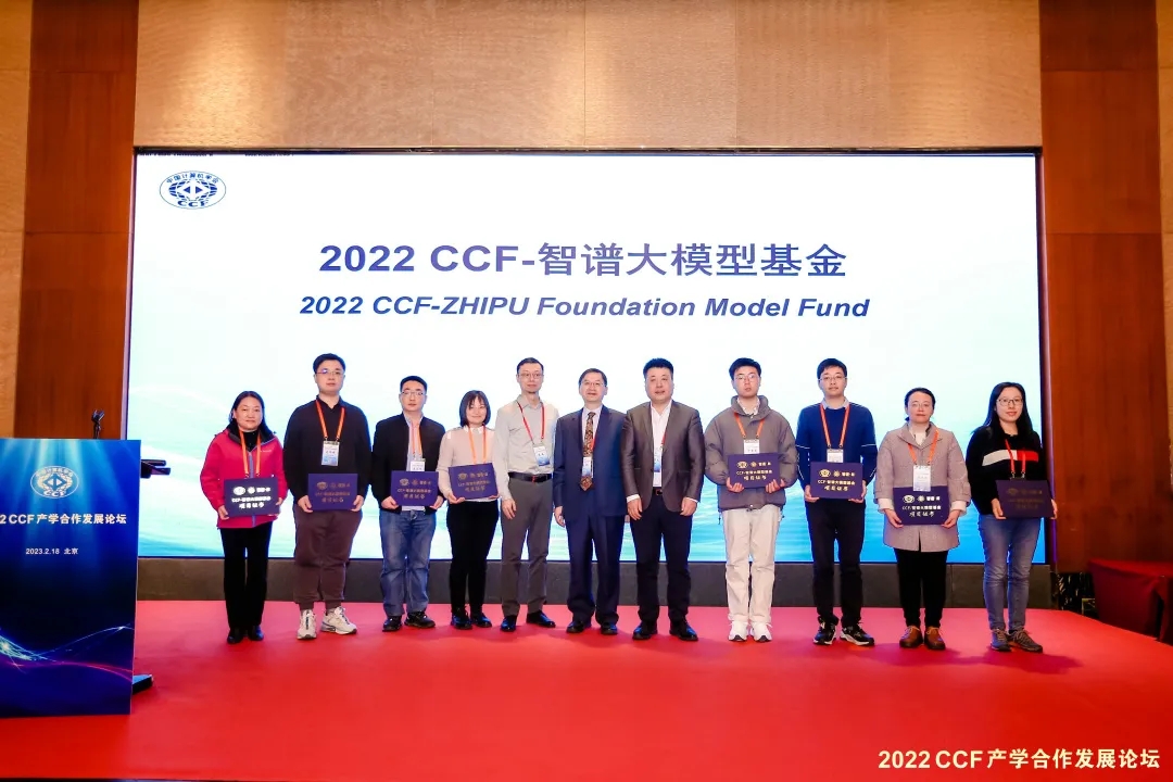 从左至右分别为:永利yl23411集团官网胡新荣、中国人民大学高泽峰、南京航空航天大学李丕绩、北京理工大学胡琳梅、智谱CEO张鹏、CCF副理事长周明、智谱总裁王绍兰、北京工商大学于重重、复旦大学桂韬、桂林理工大学谢晓兰、安徽大学赵姝