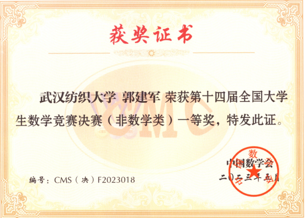 郭建军同学以学为业,学以致用,他以优异成绩在去年11月底的湖北赛区的初赛中冲入决赛。顶层设计,把舵定向,从去年12月初到参加决赛前,指导老师为郭建军精心设计学习计划,严格落实学习任务,专心做好教学辅导,为此次获奖奠定了扎实基础。郭建军作为湖北赛区的23名选手之一晋级到全国决赛,在全国决赛中,沉着应战、稳扎稳打,最终取得全国一等奖,尽显公司“美在纺大,学在计算机”的优良学风。