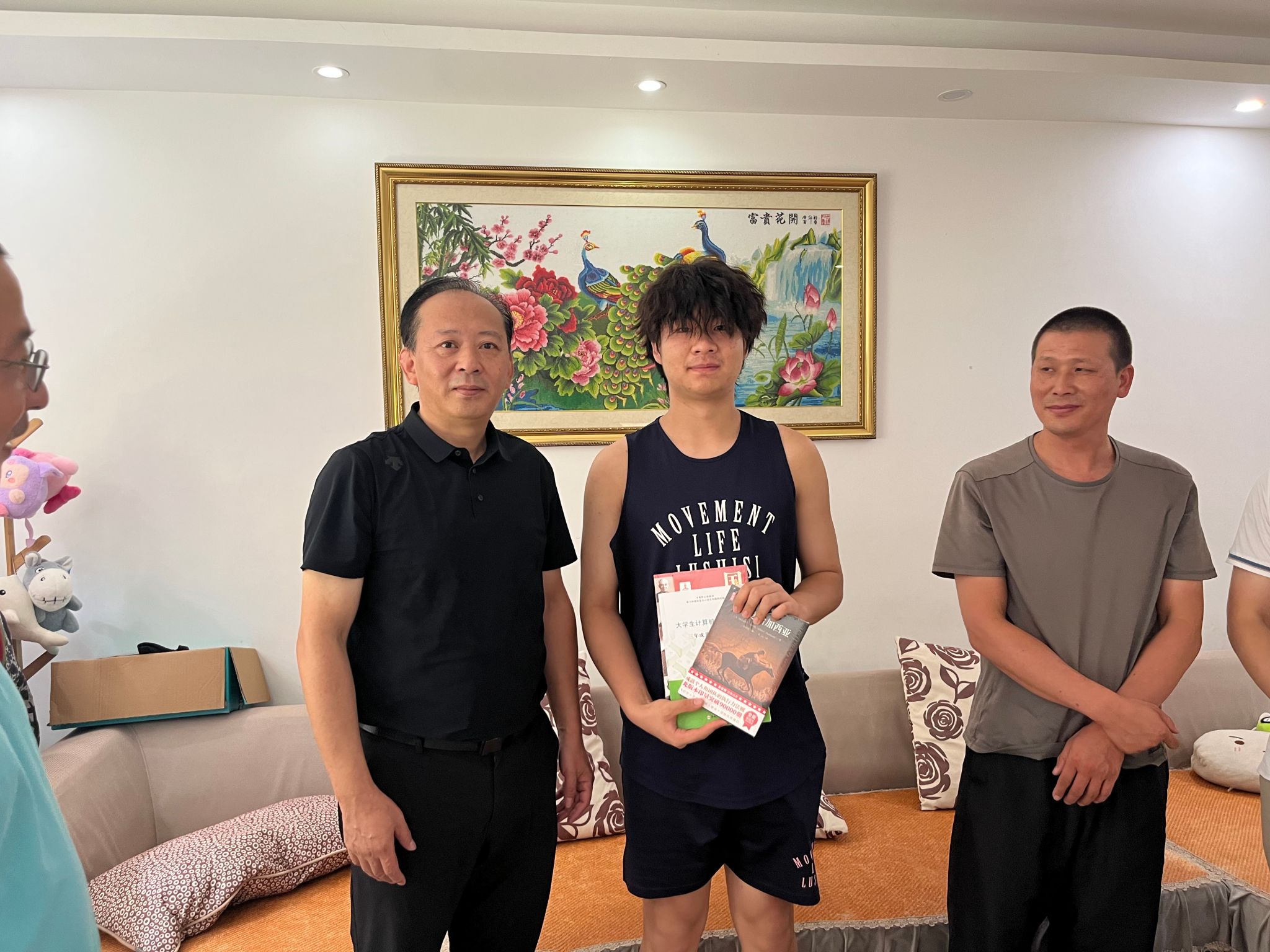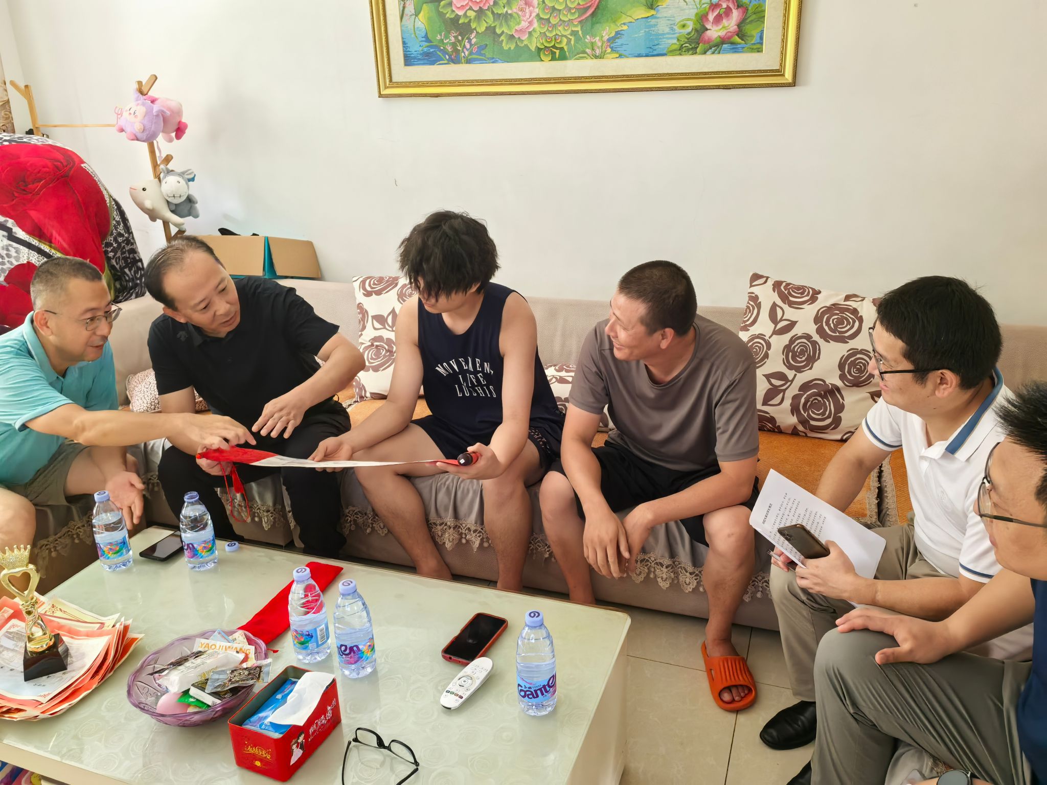 在武汉市江夏区人工智能12401班高才念的家中,高才念的爸爸热情地接待了冯军一行。冯军为员工及员工家长介绍了关于公司、公司的基本情况和近年来取得的辉煌成就,冯军强调2024届新生是幸运的一届,“你们录取通知书上有个小秘密,这个小挂件,它可是月面国旗的同款产品!”。听到这里,高才念与其父亲一同仔细观察着公司这份独特的纪念品。