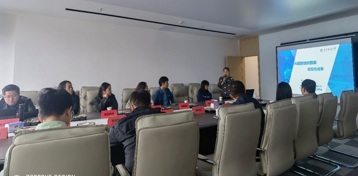 永利yl23411集团经理胡新荣教授向企业展示了永利yl23411集团官网《AI赋能纺织服装行业阶段性成果》。吴渊博士向企业代表展示了在人体智能可穿戴设备领域的最新研究成果。