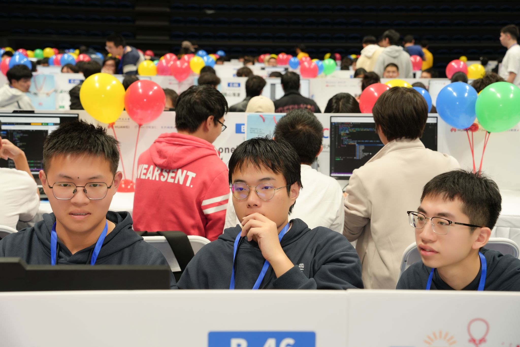图2 孔浩杰、谢飞、林舒乐(从左至右)参加ICPC杭州站的现场照片
