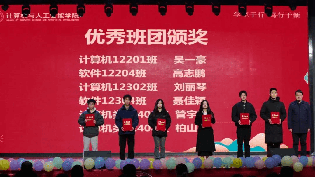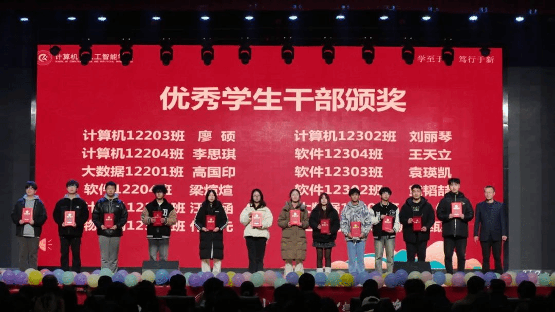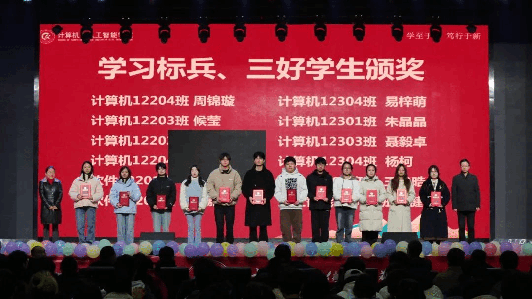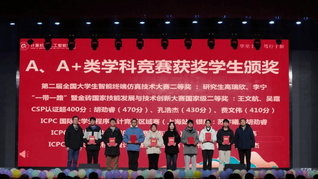 随后,大会依次对优秀班团、优秀员工干部、学习标兵、三好员工以及在A类、A+学科竞赛和CSP高分员工进行了表彰。颁奖环节气氛热烈,获奖者们在全场师生的掌声中上台领奖,彰显了计智学子的卓越风采。